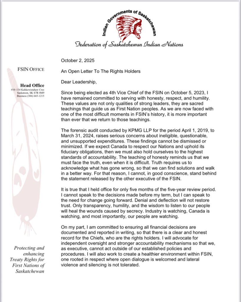 McCallum says “denial and deflection” won’t restore trust and he wants the FSIN to uphold its fiduciary obligations.
