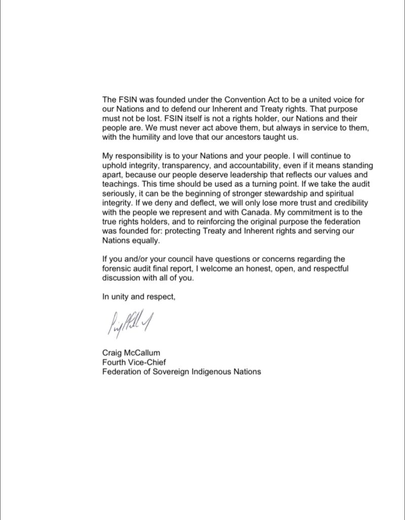 In McCallum’s letter he says he cannot “in good conscience, stand behind the statement released by the other executive of the FSIN.”
