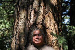 Joe Gilchrist, a Secwépemc firekeeper, stands in a forest by Fox Farm Road near Merritt, in Nlakaʼpamux and syilx territory, on July 16. His crew treated this specific landscape with a cultural fire decades ago, and estimates that it’s been nearly 20 years since the area has been prescribed with a burn. Photo by Aaron Hemens