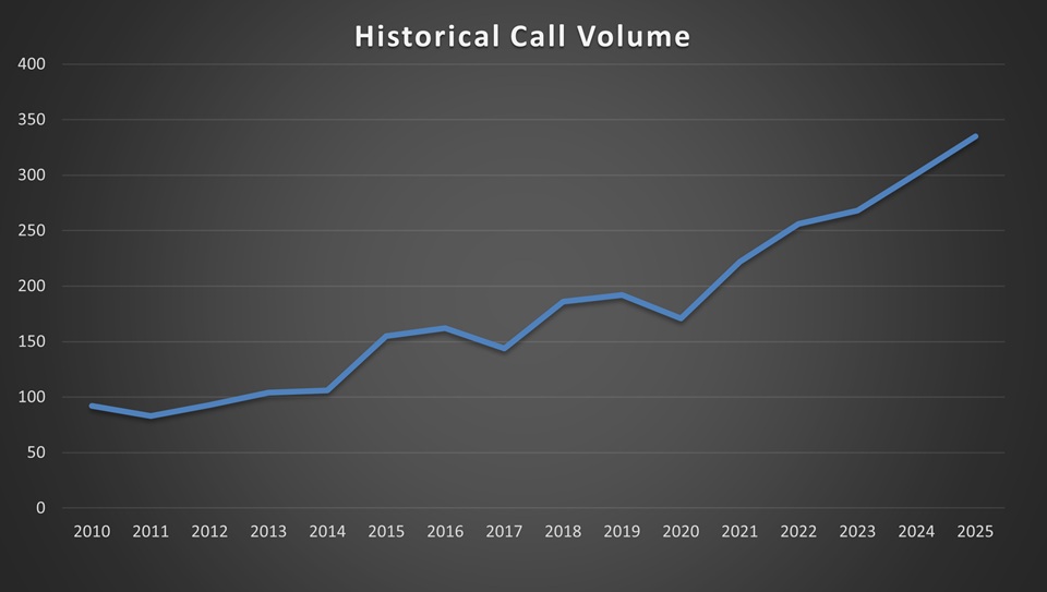Cloud said the department has recorded 335 calls for service so far this year, noting that call volumes have risen significantly over the past decade and continue to increase annually.