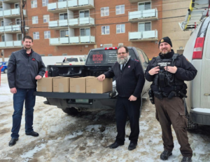 Nolan Hoggarth, Kyle Goosen and Ed Dean stand with a donation of 326 pounds of ground elk meat destined for the Salvation Army in Prince Albert, supporting meal programs after a Christmas Day fire. Courtesy of Government of Saskatchewan