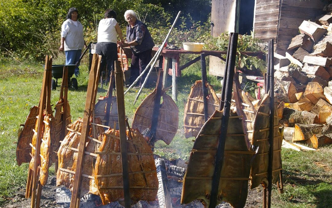 Photo: ɬaʔəmen (Tla’amin) Elders cook salmon by a fire. A new cookbook and harvest guide by their nation aims to gather the community’s recipes, stories and tips. / Photo courtesy Tla’amin Nation
