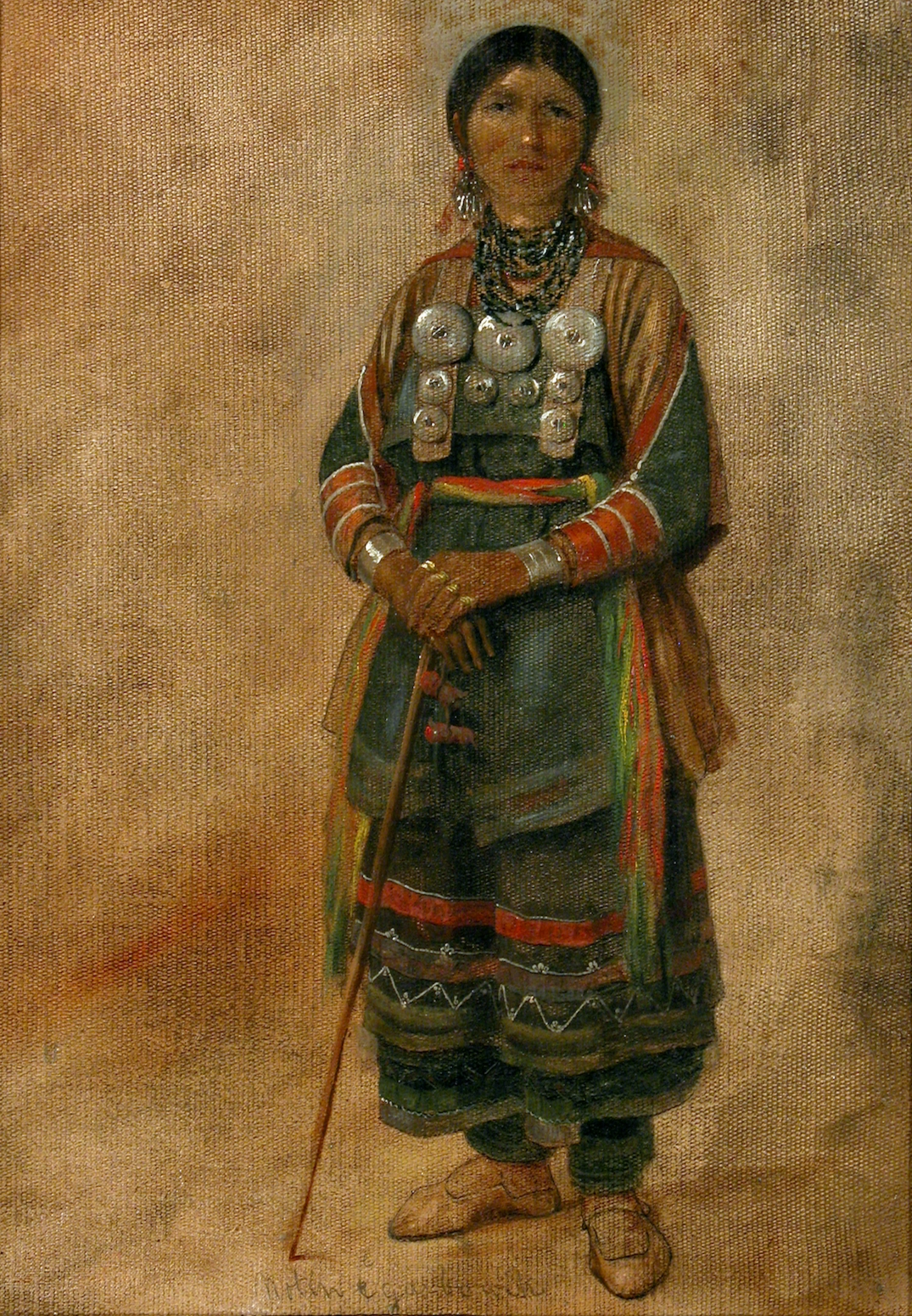 Eastman Johnson’s 1857 painting Notin e Garbowik (Standing Wind Woman) portrays a woman wearing a strap dress in Minnesota, part of the artist’s Paintings of Chippewa Indians collection.