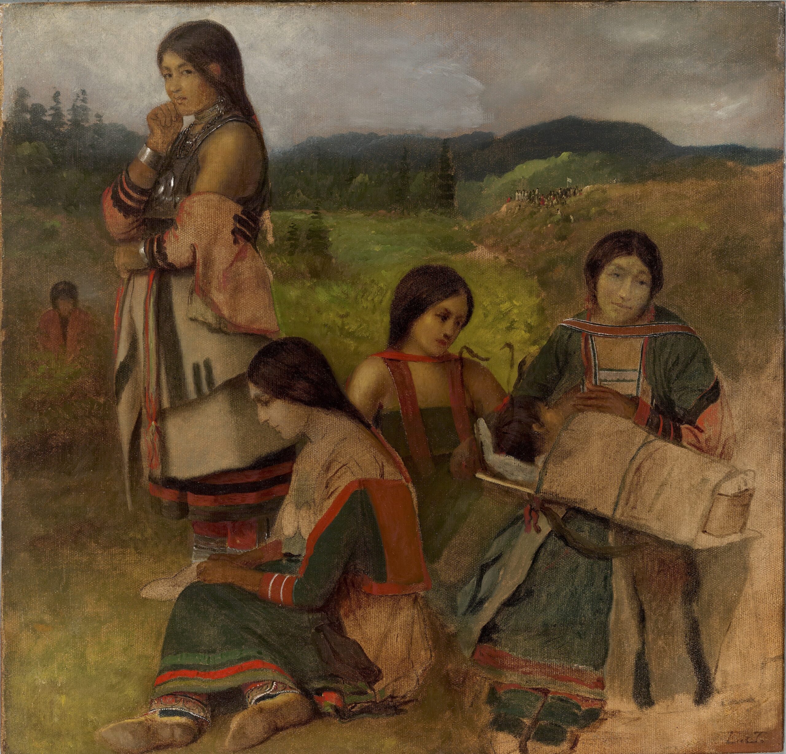 Eastman Johnson’s 1857 oil painting Ojibwe Women depicts women in strap dresses in Minnesota, part of the artist’s Paintings of Chippewa Indians collection. (St. Louis County Historical Society 20051017)