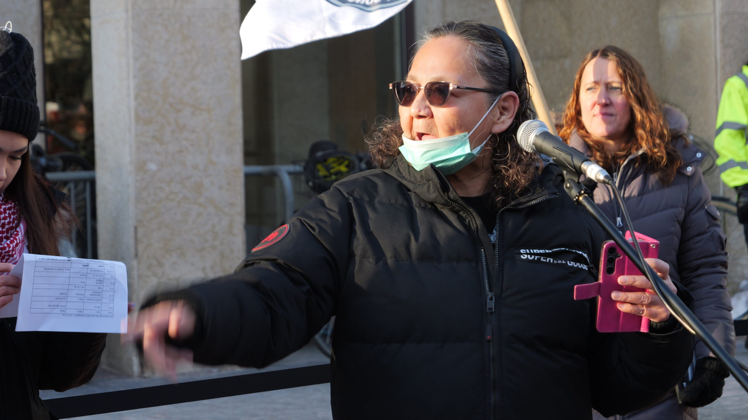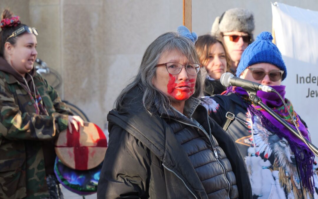 Photo: Vivian Ketchum, an Anishinaabe grandmother from Wauzhushk Onigum First Nation who lives in ‘Winnipeg,’ speaks at a rally against a controversial anti-protest bylaw outside City Hall on Feb. 17, alongside other community groups opposed to the withdrawn proposal. / Crystal Greene, Local Journalism Initiative Reporter
