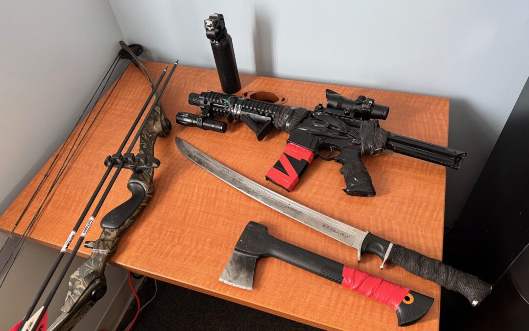 Île-à-la-Crosse RCMP located the male parked in a vehicle on Burnouf Street and officers searched the vehicle, and found a firearm, machete, as well as other weapons were seized.