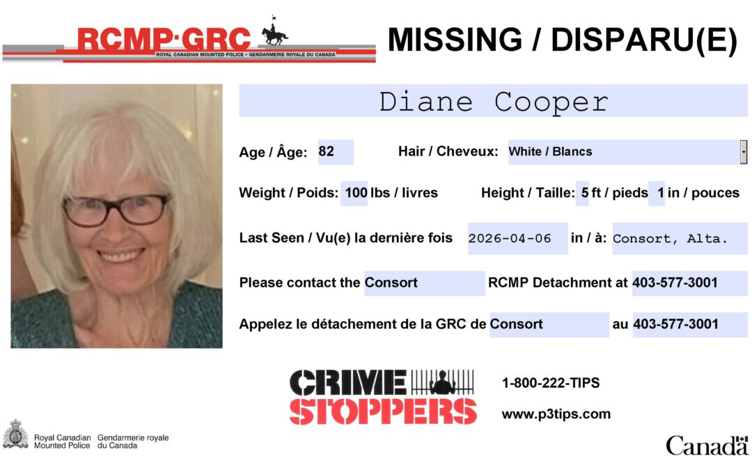 Anyone with information as to Diane’s whereabouts are asked to contact Consort RCMP at 403-577-3001 or 310-RCMP (7267).